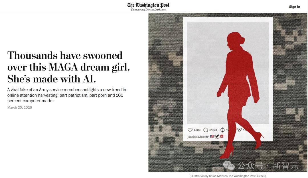 3月20日,《华盛顿邮报》披露,这个账号从头到尾都带着典型的 AI 破绽:美国陆军查不到Jessica Foster的服役记录。