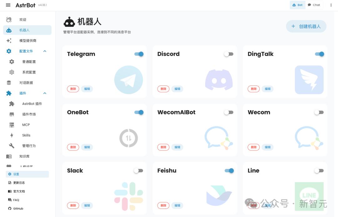 这个项目后来逐渐长成一个开源的 Agentic 聊天机器人编排平台,可以把多种 AI 能力接进多个即时通讯平台里,支持 QQ、企业微信、飞书、钉钉、Telegram、Slack 等渠道,也有 WebUI、Agent 沙箱、Sub Agents 和插件体系。