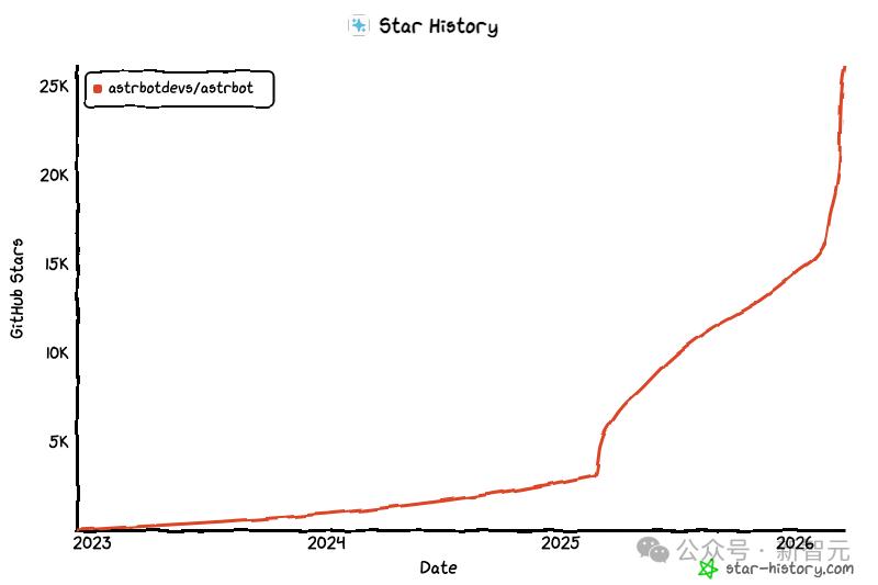 到 2026 年 3 月,AstrBot 在 GitHub 上已经来到 2.6 万 Star、1800 多个 Fork、234 位贡献者,官方 README 里写着「1000+ 插件可一键安装」。