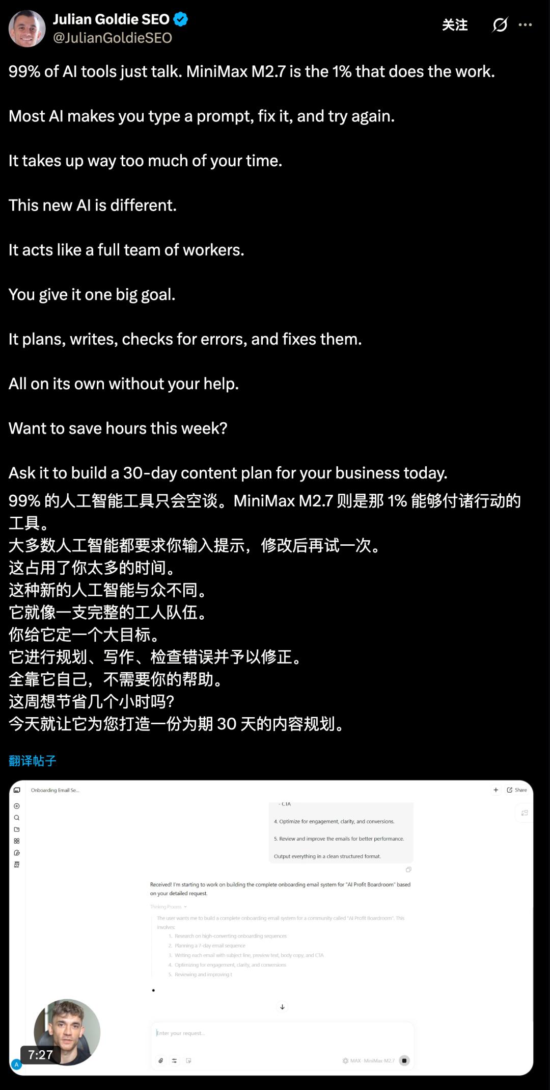 一句话总结就是,M2.7是一个又能干活,又能协作,还挺会玩的大模型。