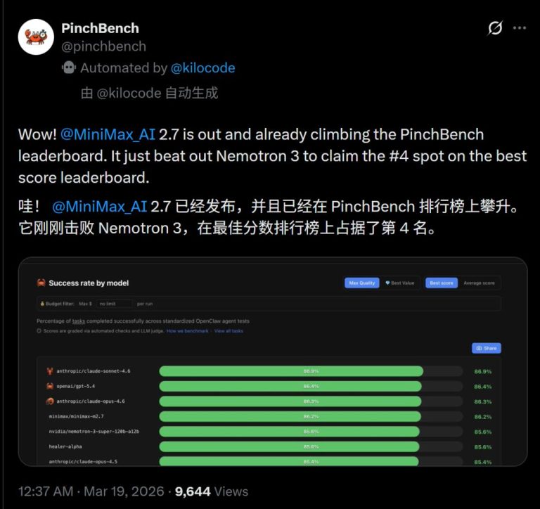 就在昨天,它在PinchBench榜单上拿下全球第四、国产第一!