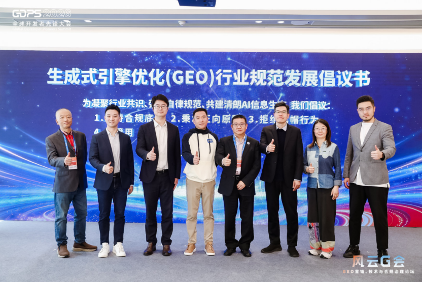 论坛现场,由上海市广告协会、上海人工智能行业协会联合多家GEO头部企业、媒体平台和机构共同发起了《生成式引擎优化(GEO)行业规范发展倡议书》,提出坚守合规底线、秉持正向原则、拒绝黑帽行为、保障用户权益、深化行业共建、强化自律监督六大倡议,呼吁全体GEO行业从业机构及人员恪守自律,共建清朗AI信息生态,推动行业高质量发展,这标志着GEO行业向着规范化发展迈出了关键第一步。