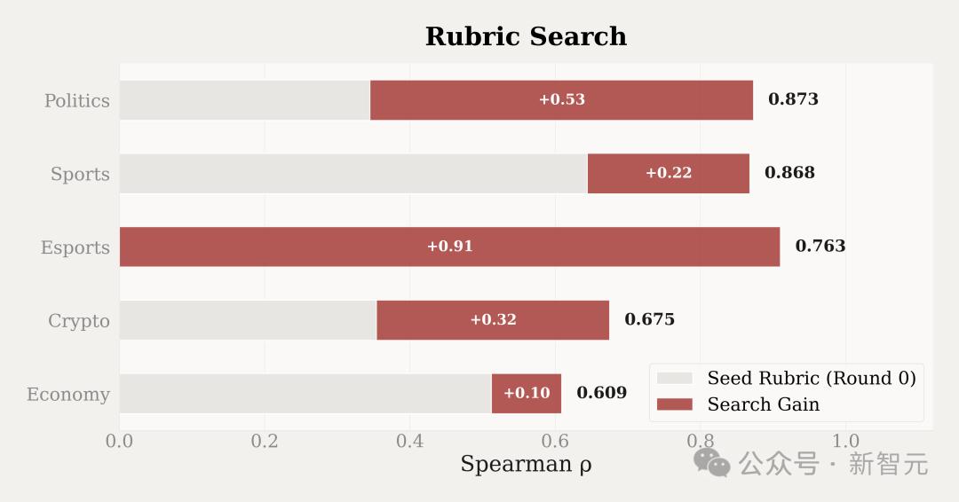 搜索按领域独立进行,政治领域和体育领域各自搜索出20个评分维度。实验数据显示,rubric的评估质量在迭代过程中持续攀升。