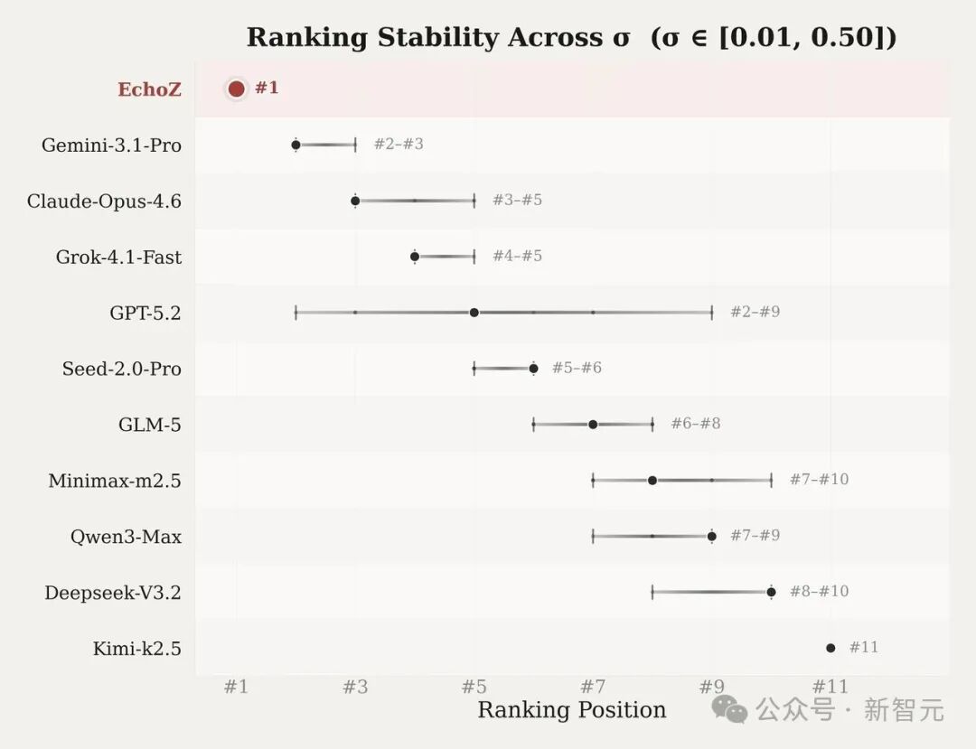 EchoZ在全部9个分组均保持第一,是唯一排名未发生任何波动的模型。作为对比,GPT-5.2的排名在第2到第9之间波动过8个位次。