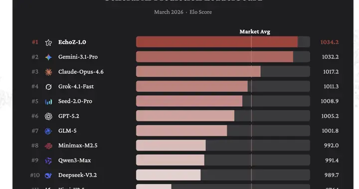 在General AI Prediction Leaderboard 上(2026年3月数据),EchoZ-1.0以Elo 1034.2排名第一,领先 Google的Gemini-3.1-Pro(1032.2)和Anthropic的Claude-Opus-4.6(1017.2)。