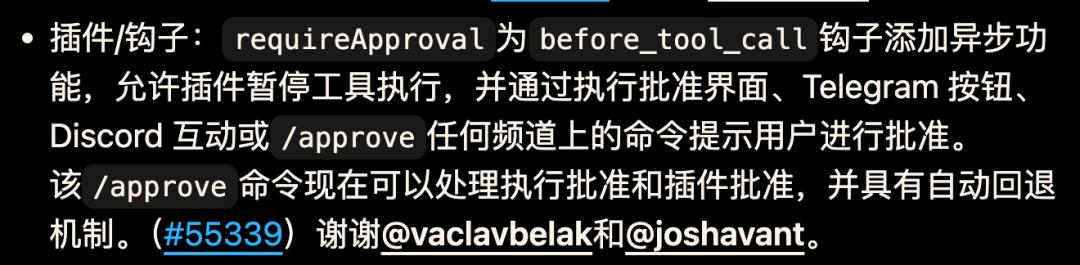 最夸张的,是插件系统加入了一个叫 requireApproval 的异步拦截功能。