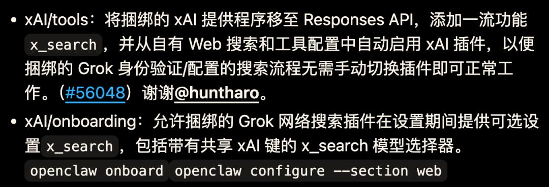 xAI/引导流程:内置 Grok 网页搜索插件现可在 openclaw onboard 及 openclaw configure –section web 期间提供可选的 x_search 配置,包含使用共享 xAI 密钥的 x_search 模型选择器。