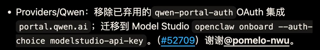 提供商/通义千问:移除已废弃的 qwen-portal-auth OAuth 集成(用于 portal.qwen.ai),迁移至 Model Studio,可通过 openclaw onboard –auth-choice modelstudio-api-key 完成接入。