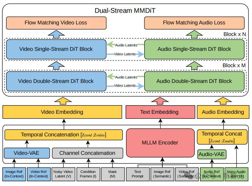 它自研了一套双流MMDiT架构,视频和音频不再是两个模型各生成各的,而是在同一个模型内部通过双向交叉注意力同时生成,音画从第一帧起就是锁死同步的。