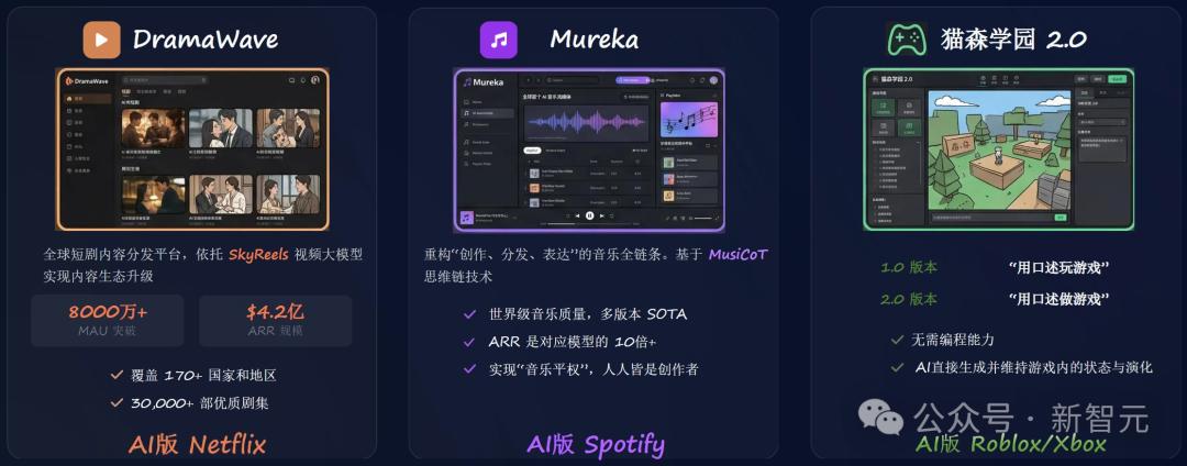 配合AI短剧平台Dramawave、AI音乐平台Mureka、AI游戏平台猫森学园2.0等产品矩阵,文本、音乐、视频、游戏四大领域全覆盖。