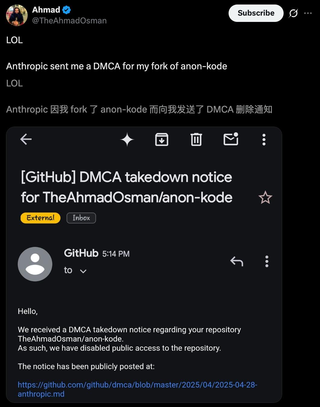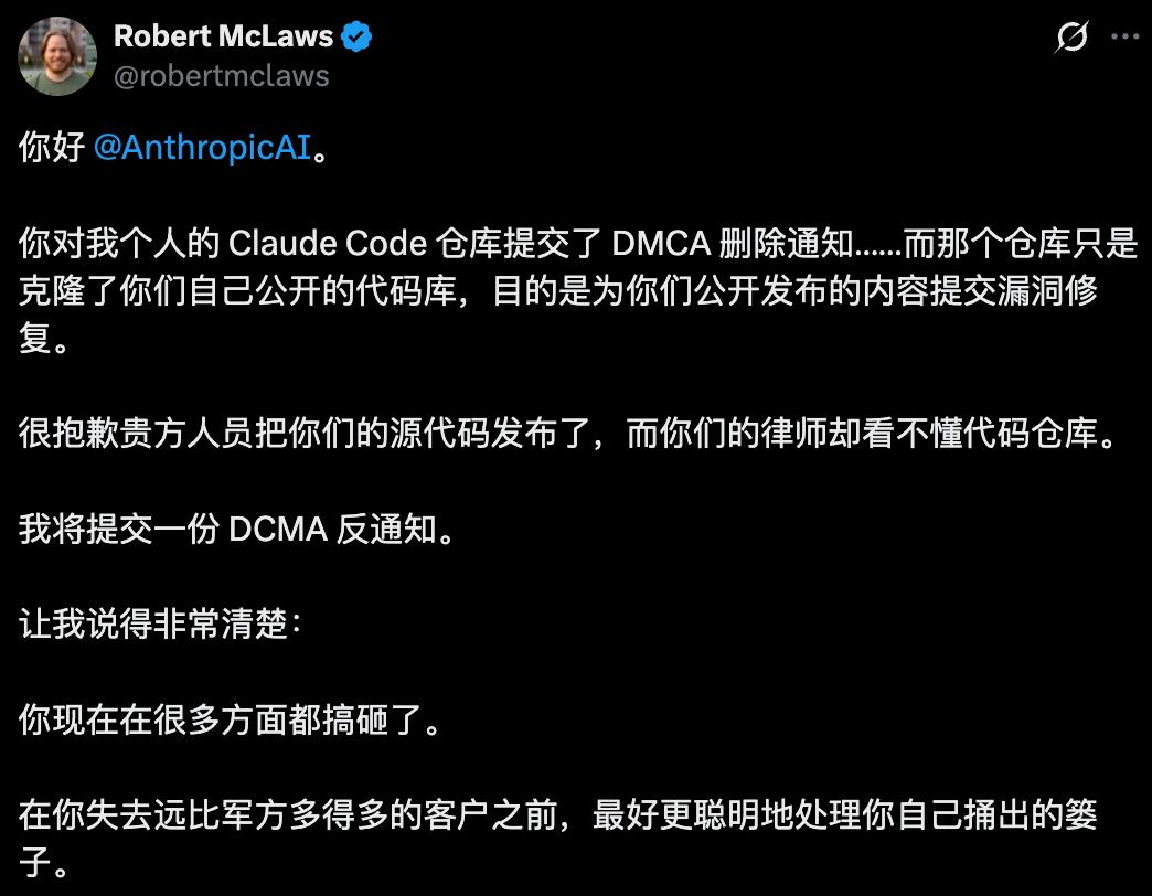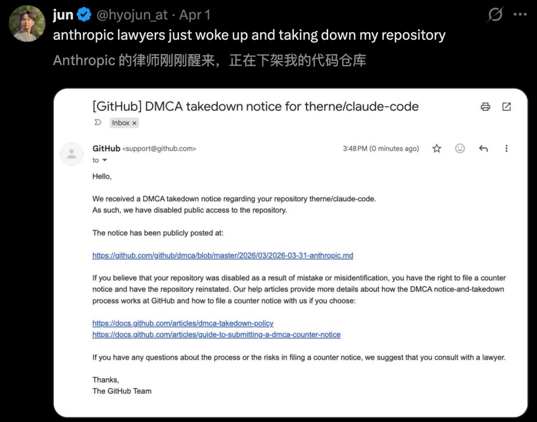 意识到大事不妙的Anthropic随即祭出法律大招,向GitHub发送了DMCA版权删除通知。