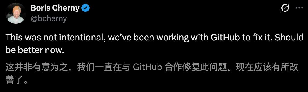 Claude Code之父Boris Cherny紧急救火,他表示,「这不是有意为之,正GitHub一起修复问题」。