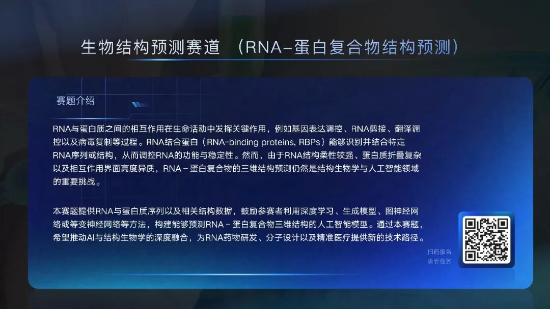 生物结构预测赛道聚焦RNA–蛋白复合物三维结构预测这一关键前沿问题。针对RNA构象高度柔性、相互作用界面复杂且异质性强等核心挑战,鼓励选手发展融合深度学习、生成式建模与等变神经网络的统一建模框架,实现对分子序列、空间构型与相互作用关系的协同刻画。
