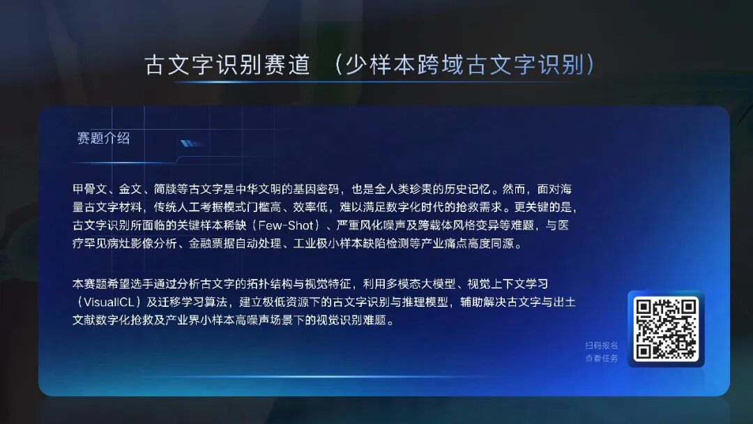 「本赛道重点考察三类能力,包括从复杂图像中提取信息的能力、多技术栈融合的工程能力,以及在有限资源下实现高效建模的能力。」赛题组成员、复旦大学出土文献与古文字研究中心副研究员任攀表示,依托甲骨文、金文、简牍等多载体权威数据,赛道将围绕古文字的检测、识别与结构化解析等关键环节展开,希望能吸引和组织更多开发者参与探索早期中华文明的数字化传承与系统性研究。